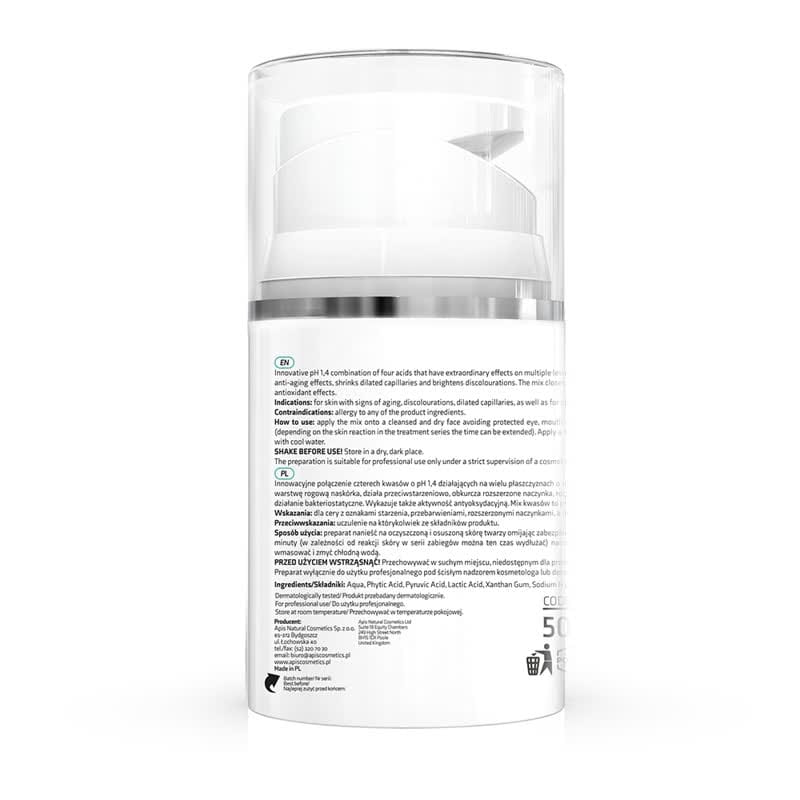 Innovative pH 1,4 combination of four acids that have effects on multiple levels with extraordinary properties. The product intensively exfoliates stratum corneum, has anti-ageing effects, shrinks dilated capillaries and brightens discolouration. The mix closes the enlarged skin pores and has a bacteriostatic as well as antioxidant effects.