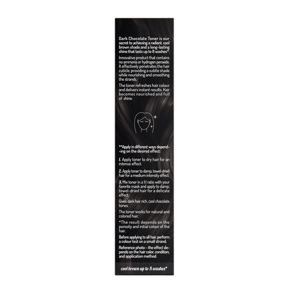 Refresh and enhance your brown hair with OnlyBio Hair in Balance Dark Chocolate Toner. This ammonia-free and peroxide-free formula delivers a cool, deep brown shade inspired by rich dark chocolate. Perfect for both natural and dyed hair, it revives faded colour, neutralises unwanted warm tones, and adds luminous shine — all while caring for your hair.